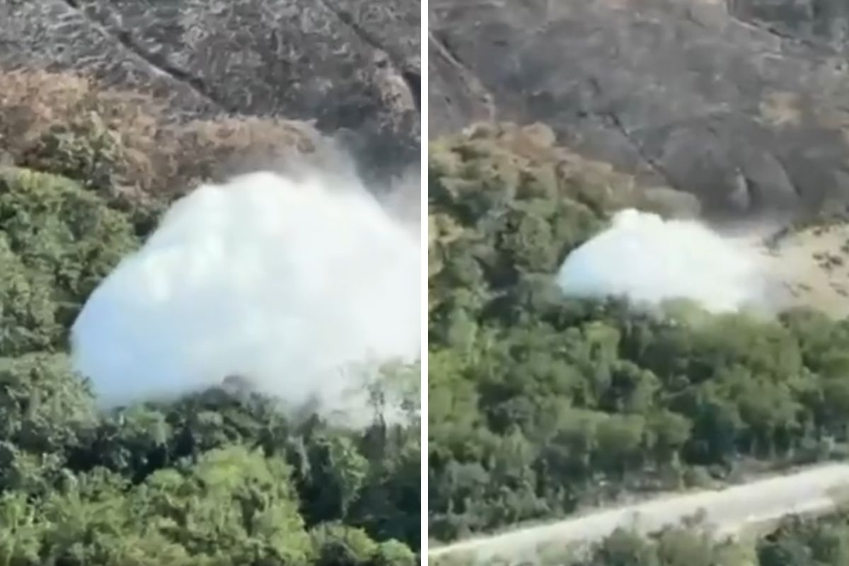 As imagens aéreas, captadas pelo RJ1, mostram o volume e a força da água sendo lançada no ar, chamando a atenção de moradores e motoristas que passavam pela região.