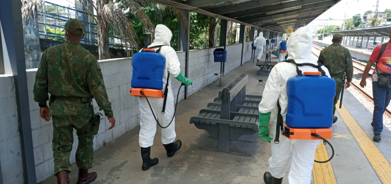 Militares do Exército e da Marinha realizaram nova higienização especial de estações da SuperVia como forma de combater a proliferação do novo coronavírus. Na manhã e na tarde de hoje, o serviço ocorreu nas estações Corte Oito, Ricardo de Albuquerque e Saracuruna.