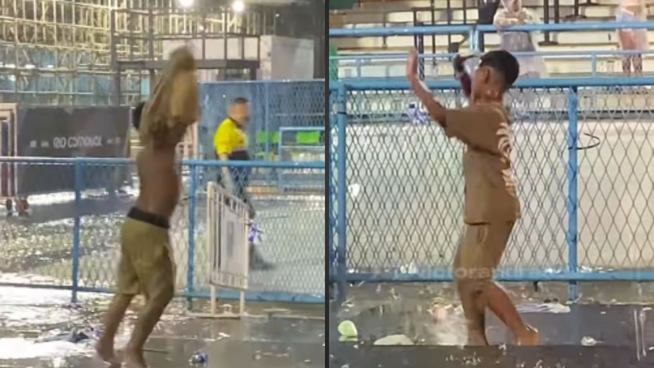 Apesar das condições climáticas adversas, Riquelme manteve a alegria, o sorriso e seguiu sambando na Sapucaí, chamando a atenção de quem estava no local. A cena acabou contagiando o público presente.