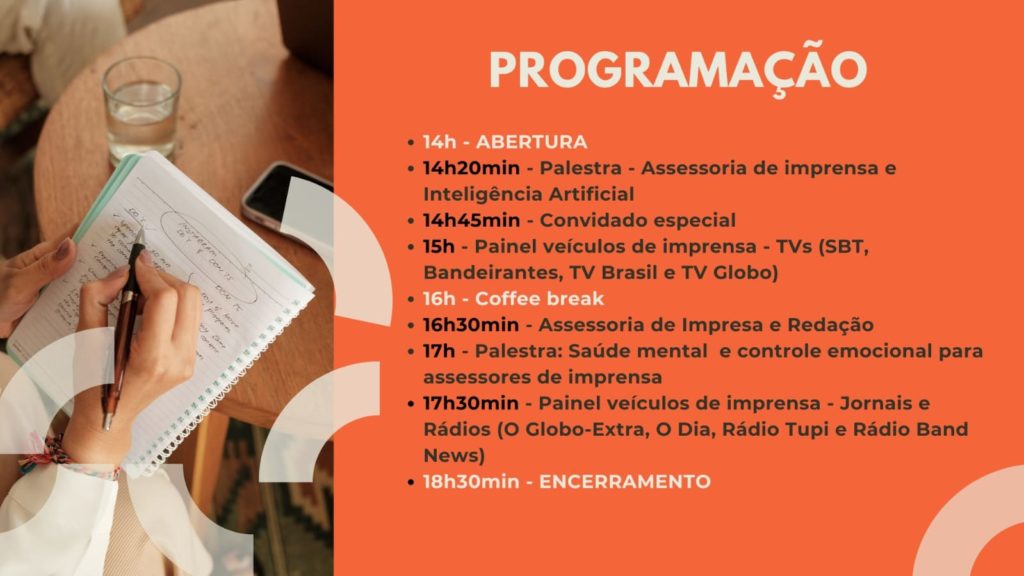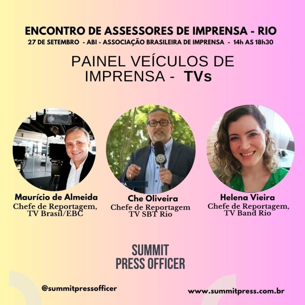 Para tratar desse assunto, o evento terá dois painéis focados nas relações entre veículos de comunicação e assessores de imprensa. O painel “Veículos de Comunicação – TVs” contará com Che Oliveira (SBT-Rio), Maurício de Almeida (TV Brasil) e Helena Vieira (Band-Rio), enquanto o painel “Veículos de Comunicação – Jornais e Rádios” terá a presença de Rafael Galdo (O Globo/Extra), Iuri Corsini (O Dia), Márcia Pinho (Rádio Tupi) e Luanna Bernardes (BandNews).