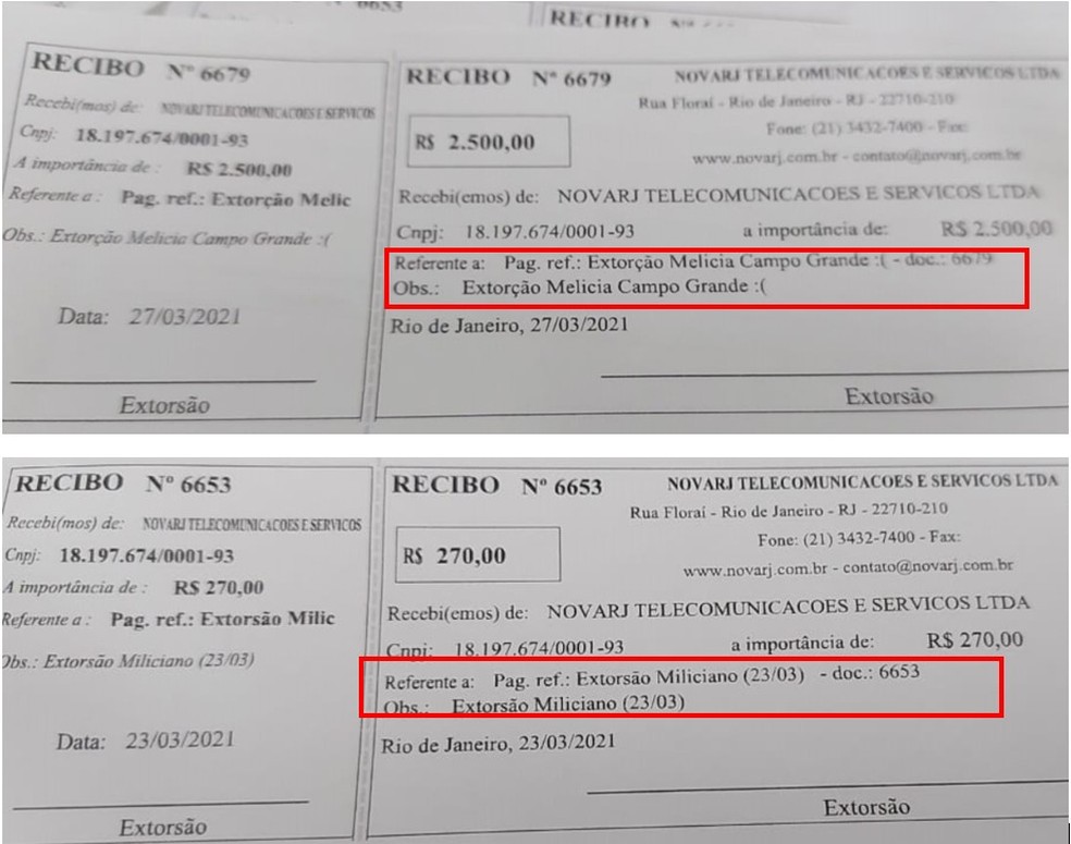 Com os criminosos, foram apreendidos recibos de pagamento feitos à milícia em que constavam a referência “pagamento extorsão miliciano”. Uma das notas cita a milícia de Campo Grande e de Santa Cruz, que é chefiada por Wellington da Silva Braga, o Ecko.