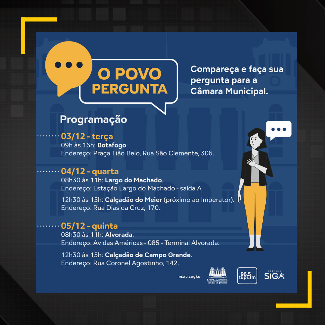 O projeto “O Povo Pergunta” está de volta! Realizado em parceria entre a Câmara Municipal do Rio de Janeiro e a Super Rádio Tupi, a iniciativa acontece entre os dias 3 e 5 de dezembro de 2024, com o objetivo de aproximar ainda mais a população dos seus representantes no Legislativo. A campanha promove um espaço de diálogo direto, onde os cidadãos podem apresentar dúvidas, demandas e sugestões, além de conhecer mais sobre as ações da Câmara e os projetos em andamento.