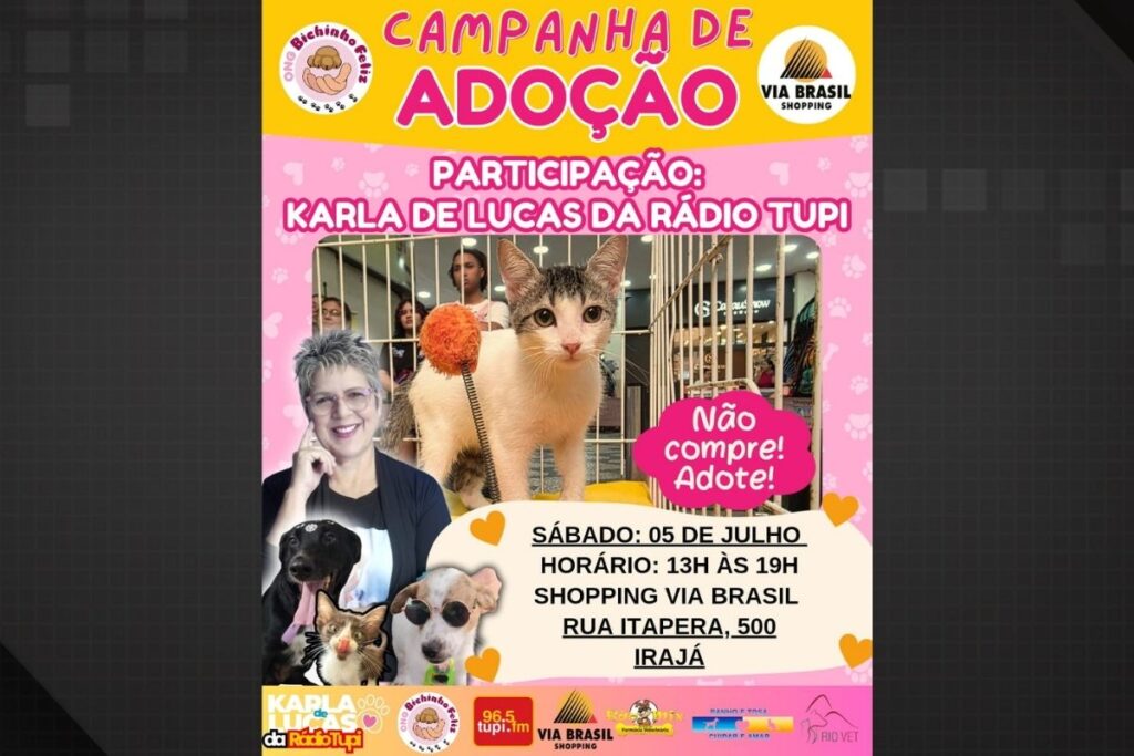 Neste sábado (5), das 13h às 19h, o Shopping Via Brasil, em Irajá, será palco de mais uma Campanha de Adoção promovida pela ONG Bichinho Feliz, com apoio da comunicadora Karla de Lucas, da Rádio Tupi. O evento busca encontrar novos lares para cachorros e gatos resgatados, além de promover a conscientização sobre a adoção responsável.
