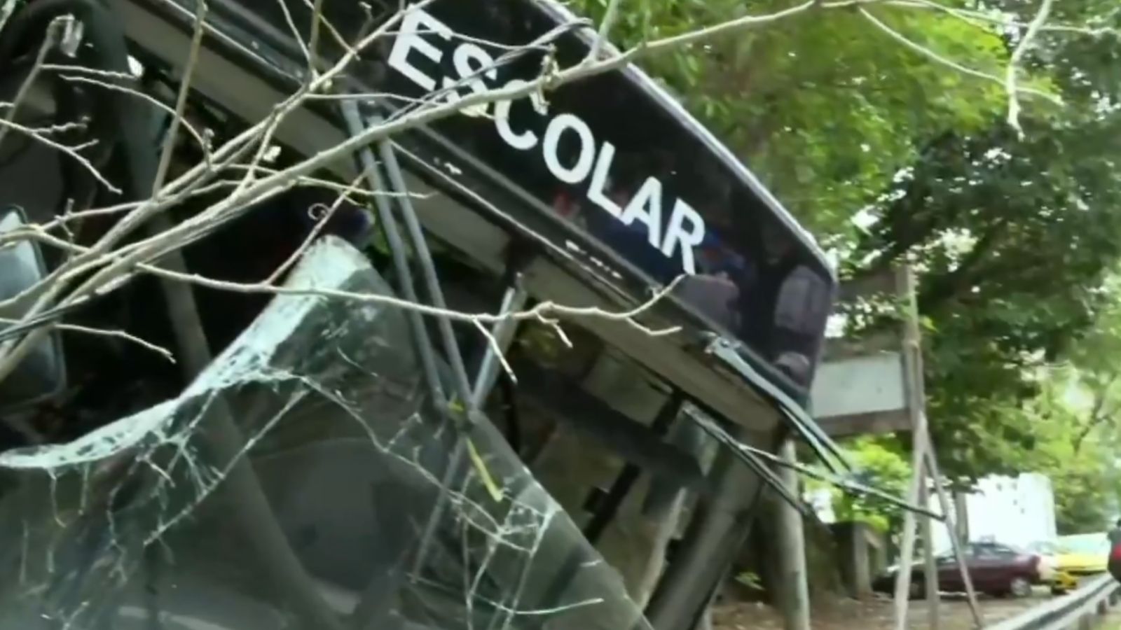 Veículo estava estacionado e vazio quando caiu; operação de remoção ocorrerá à noite.Um ônibus escolar despencou de um barranco na altura da Rocinha, em São Conrado, Zona Sul do Rio de Janeiro, no fim da manhã desta quarta-feira (15). O veículo parou na beira da Autoestrada Lagoa-Barra, próximo ao Túnel Zuzu Angel.
