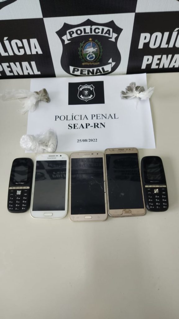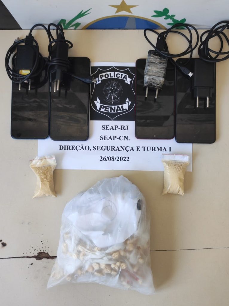 No Presídio Romeiro Neto, Complexo de Japeri, os policiais penais encontraram cinco celulares, 16 papelotes de pó branco, pesando 13 gramas, e 15 invólucros de erva seca.
