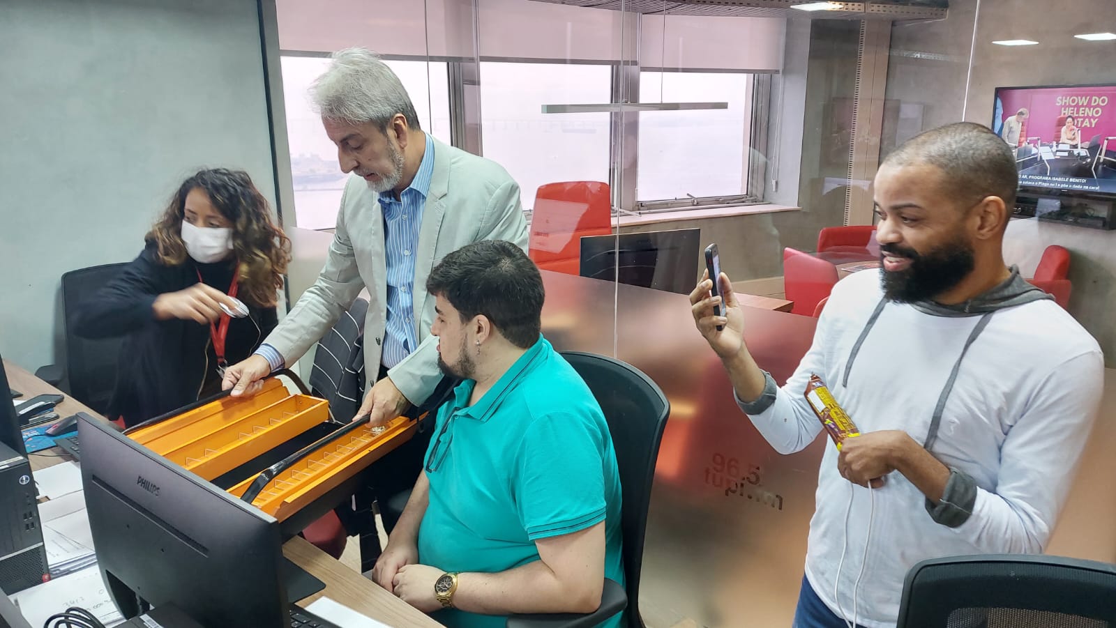 Clóvis Monteiro distribui doces produzidos por Iggor Paz para os funcionários da Rádio Tupi (Foto: Luiz Walcyr / Super Rádio Tupi)