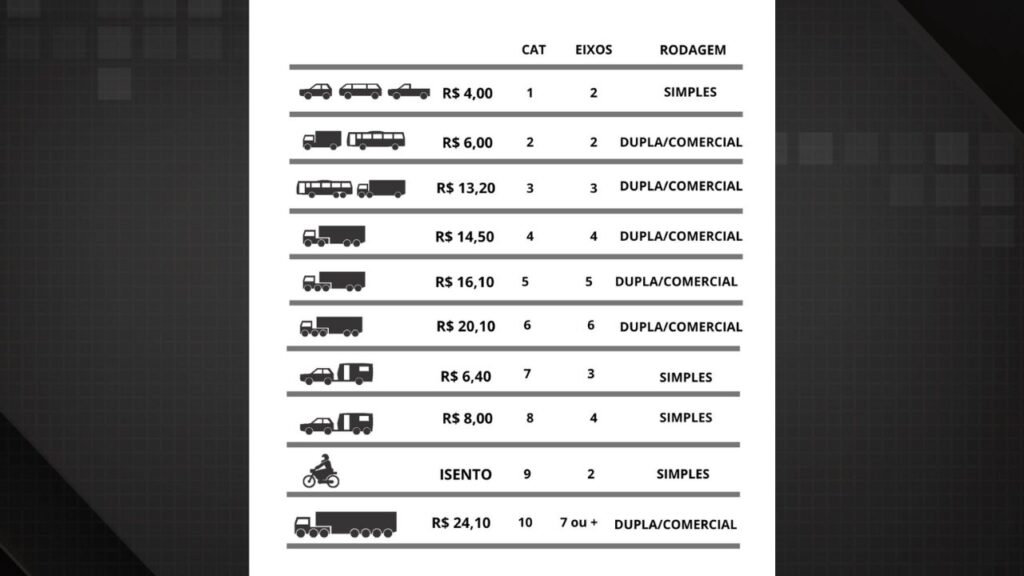 Não apenas os automóveis comuns serão impactados pela atualização dos valores. Todas as demais categorias de veículos, exceto as motos, também terão seus preços ajustados de forma proporcional pela operadora da rodovia.
