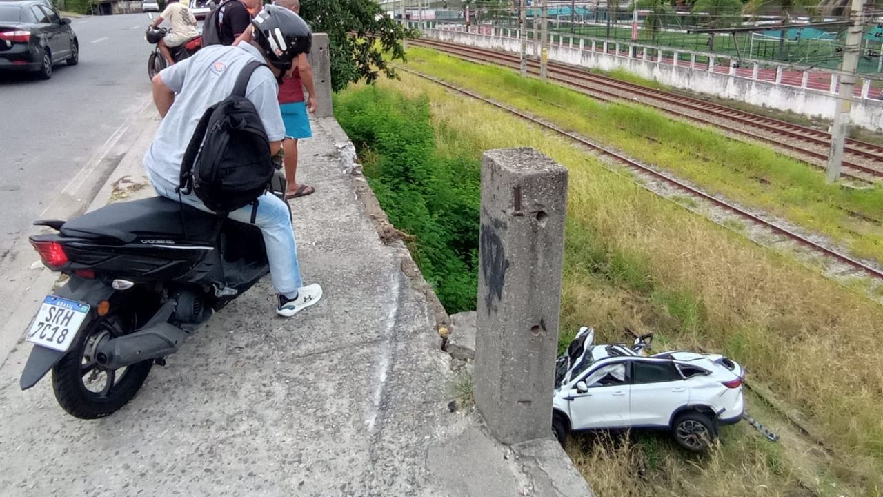 Durante a fuga, os criminosos colidiram contra cinco veículos, entre carros e motos. O automóvel acabou caindo na via férrea da Rua Visconde de Niterói.