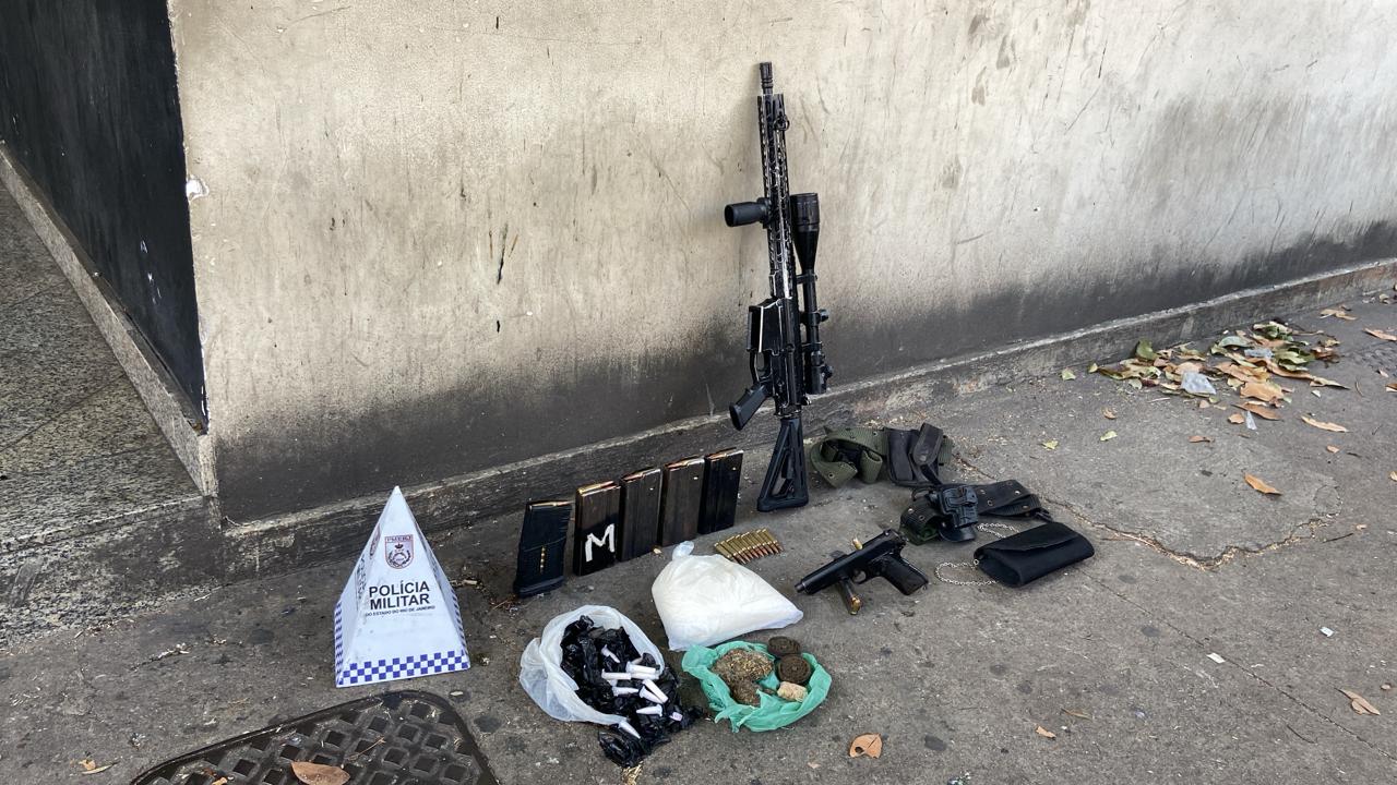 No veículo, foram encontrados, um fuzil AR10 e uma pistola colt 45, cartuchos, munições, além de pinos, grande quantidade de maconha, e mais de um quilo de cocaína.
