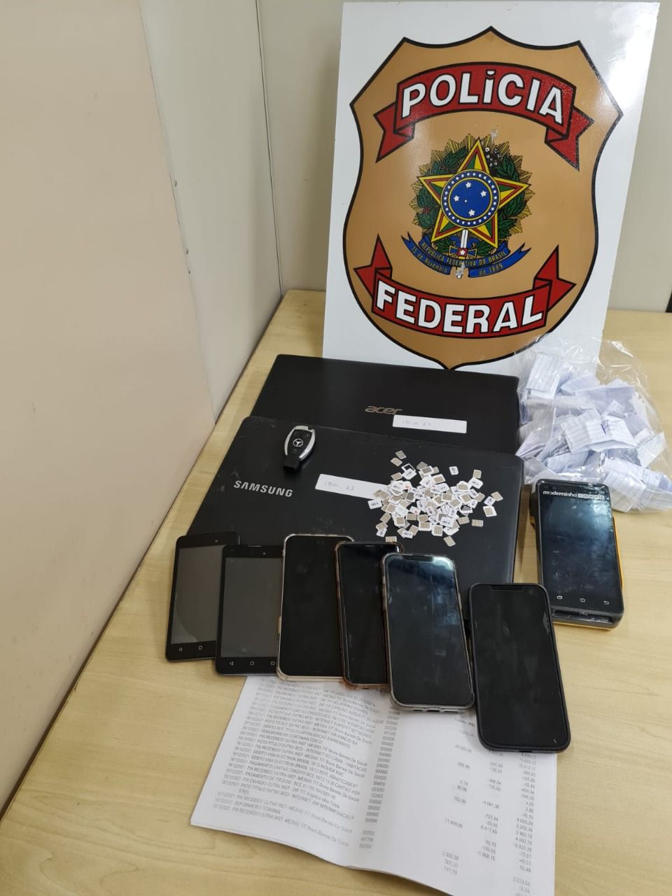De acordo com a PF, os agentes apreenderam seis celulares, dois notebooks e um veículo de luxo, com valor estimado em cerca de R$ 155.000,00, além de dezenas de chips de celulares diversos.
