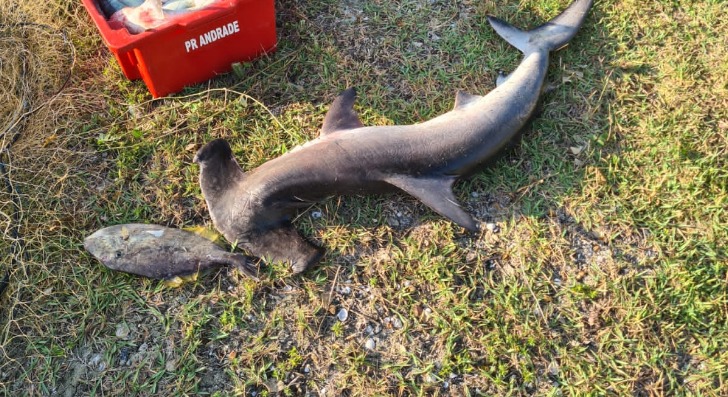 Na ação, três suspeitos foram detidos e um tubarão-martelo, ameaçado de extinção e cuja pesca é proibida, foi apreendido, além de espécies diversas de peixes e tubarões da região.