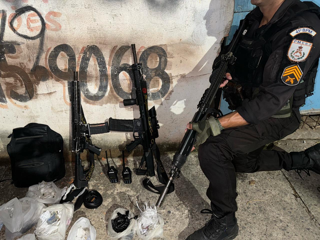 Na Muzema, na Zona Oeste, PMs do Comando de Operações Especiais apreenderam três fuzis, três pistolas, duas granadas, um rádio comunicador e diversos carregadores de fuzis municiados. Três suspeitos foram presos e encaminhados para a 16ª DP (Barra da Tijuca).