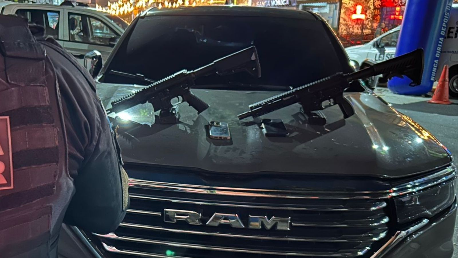 Durante uma revista no carro, na porta da unidade, os policiais encontraram dois fuzis calibre 556 no forro da mala do veículo.