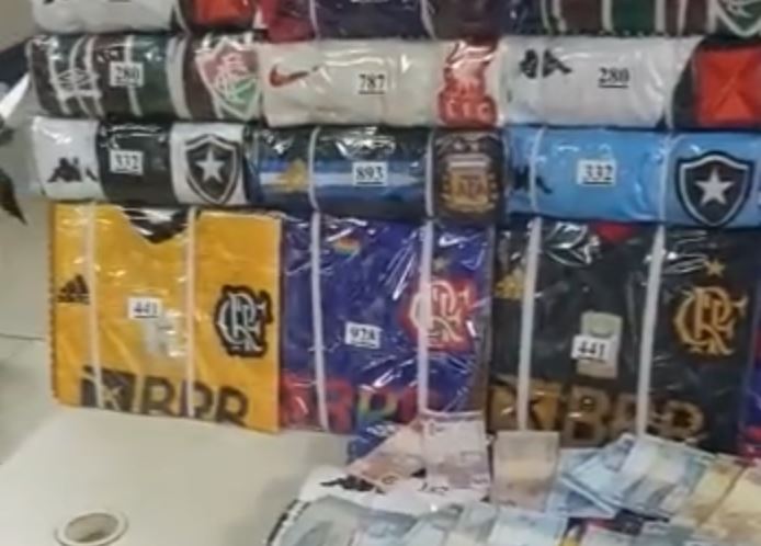 No local, os agentes encontraram camisas do Flamengo, Vasco, Fluminense, Botafogo, Seleção Brasileira, Palmeiras, entre outros times.
