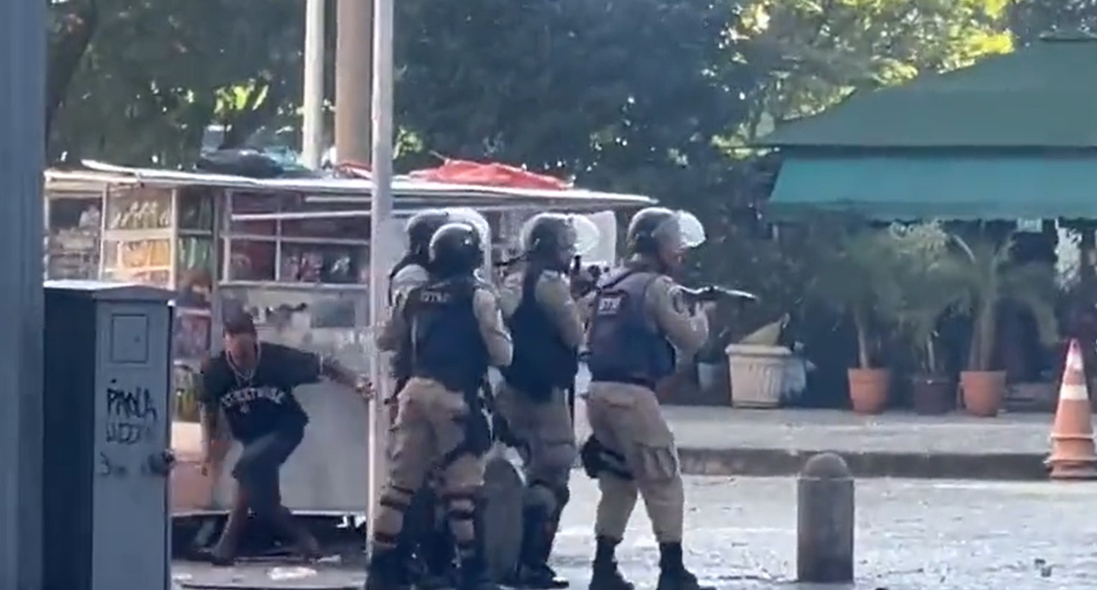 Vídeos registrados pelas redes sociais mostram os guardas municipais enfileirados, se protegendo com escudos e apontando uma arma não letal em direção a um grupo de ambulantes
