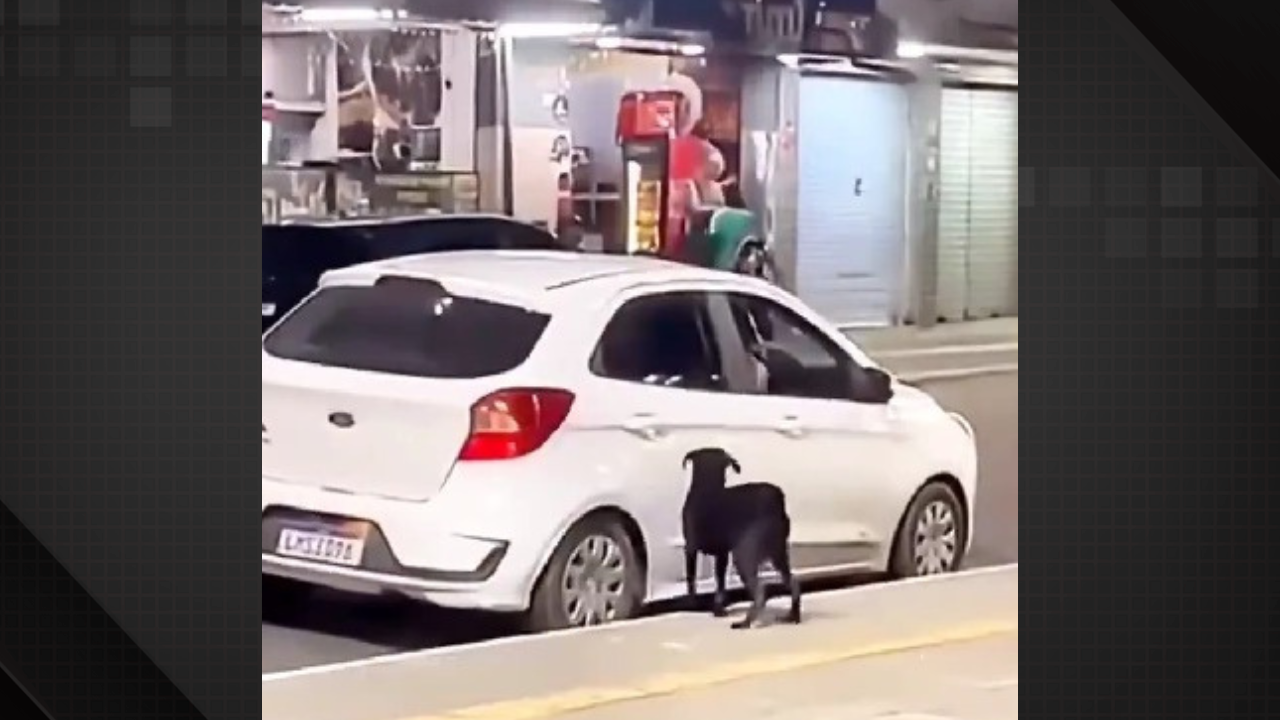 Nas imagens, o veículo estaciona perto da calçada e abre a porta traseira do lado direito. Uma mulher puxa o cachorro de dentro do carro e joga ele do lado de fora, fechando a porta do carro rapidamente.