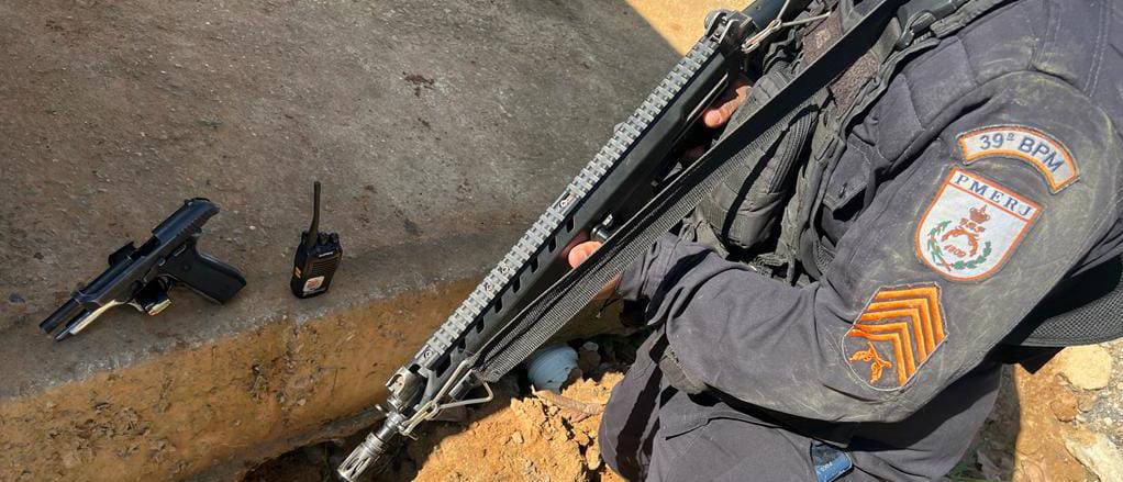 Com o criminoso, foram encontrados uma pistola calibre 0.40, rádios comunicadores e drogas.