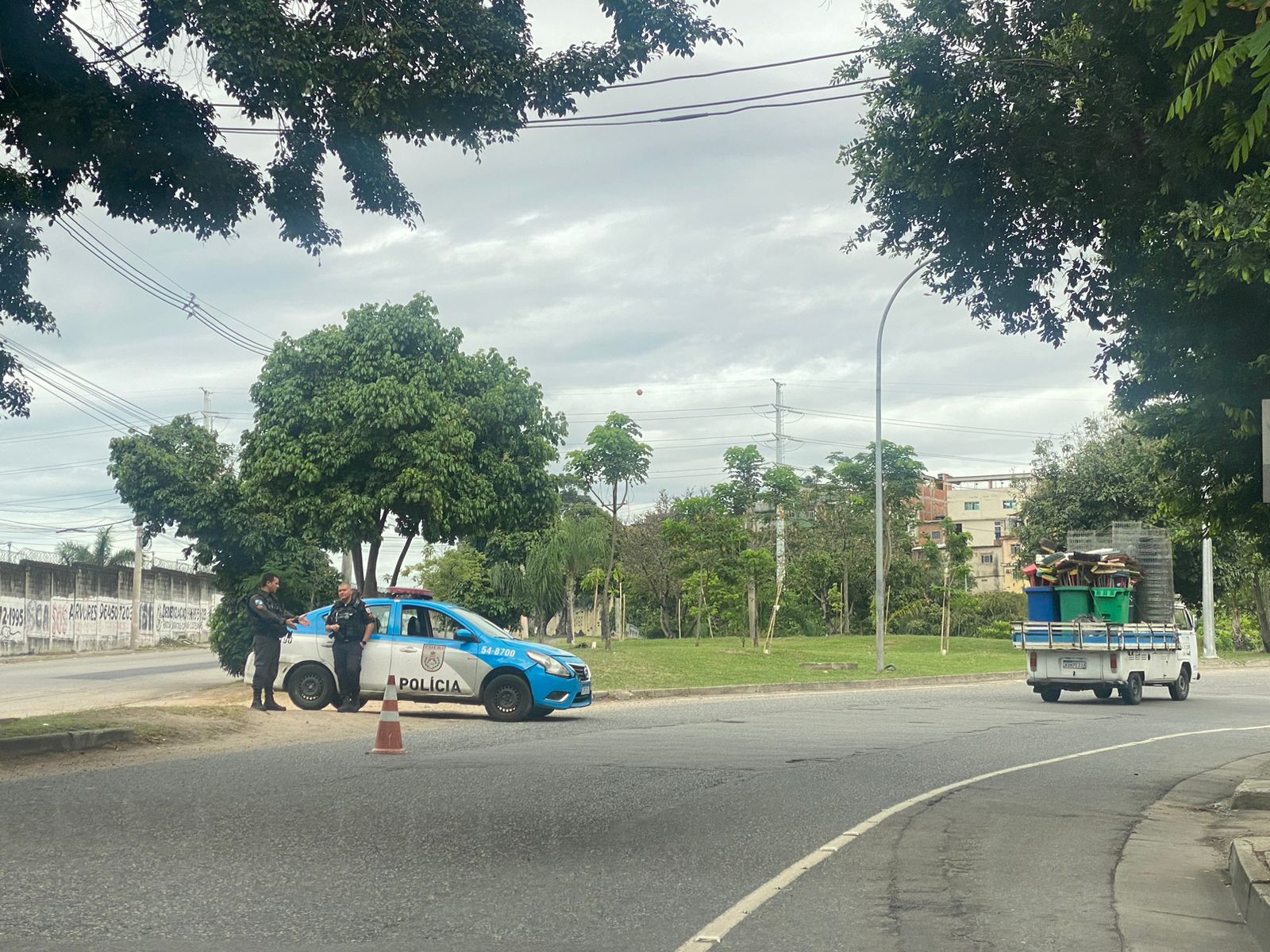 Uma viatura da Polícia Militar reforça o policiamento no entorno do shopping Nova América, na Zona Norte do Rio, local onde ontem um entregador de 28 anos foi baleado na cabeça durante um assalto, na noite desta terça-feira (06).