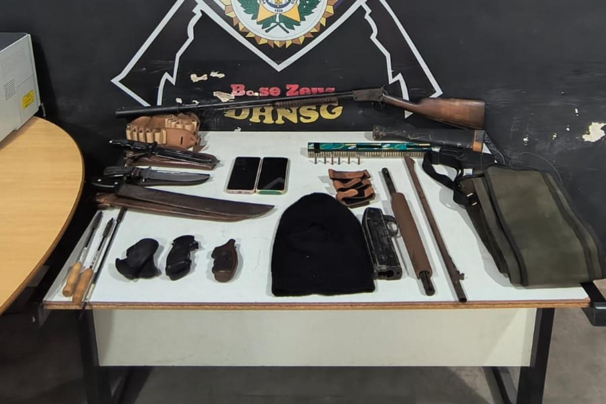 Durante o cumprimento de mandados de busca, os agentes prenderam em flagrante o tio de um dos suspeitos por posse de armas e munições. Um dos presos confessou o crime, enquanto o outro permaneceu em silêncio.