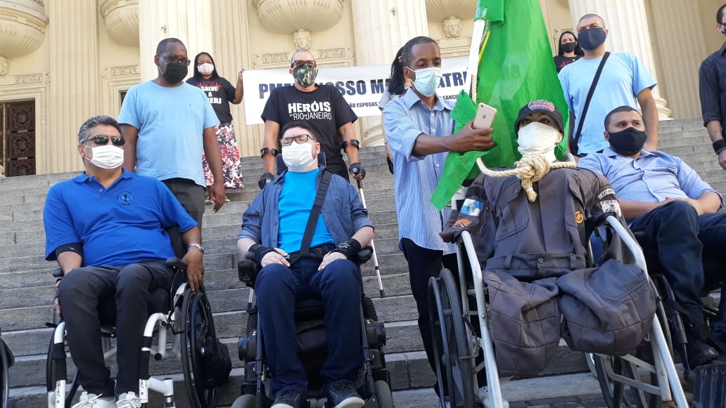 Policiais militares acidentados em trabalho, que foram aposentados por invalidez, realizaram nesta terça-feira (28), uma manifestação contra o governo do estado em frente à Assembleia Legislativa do Rio de Janeiro (Alerj). Eles alegam que o poder público vem descontando, desde janeiro, valores referentes à previdência social, o que não vinha acontecendo nas gestões anteriores.