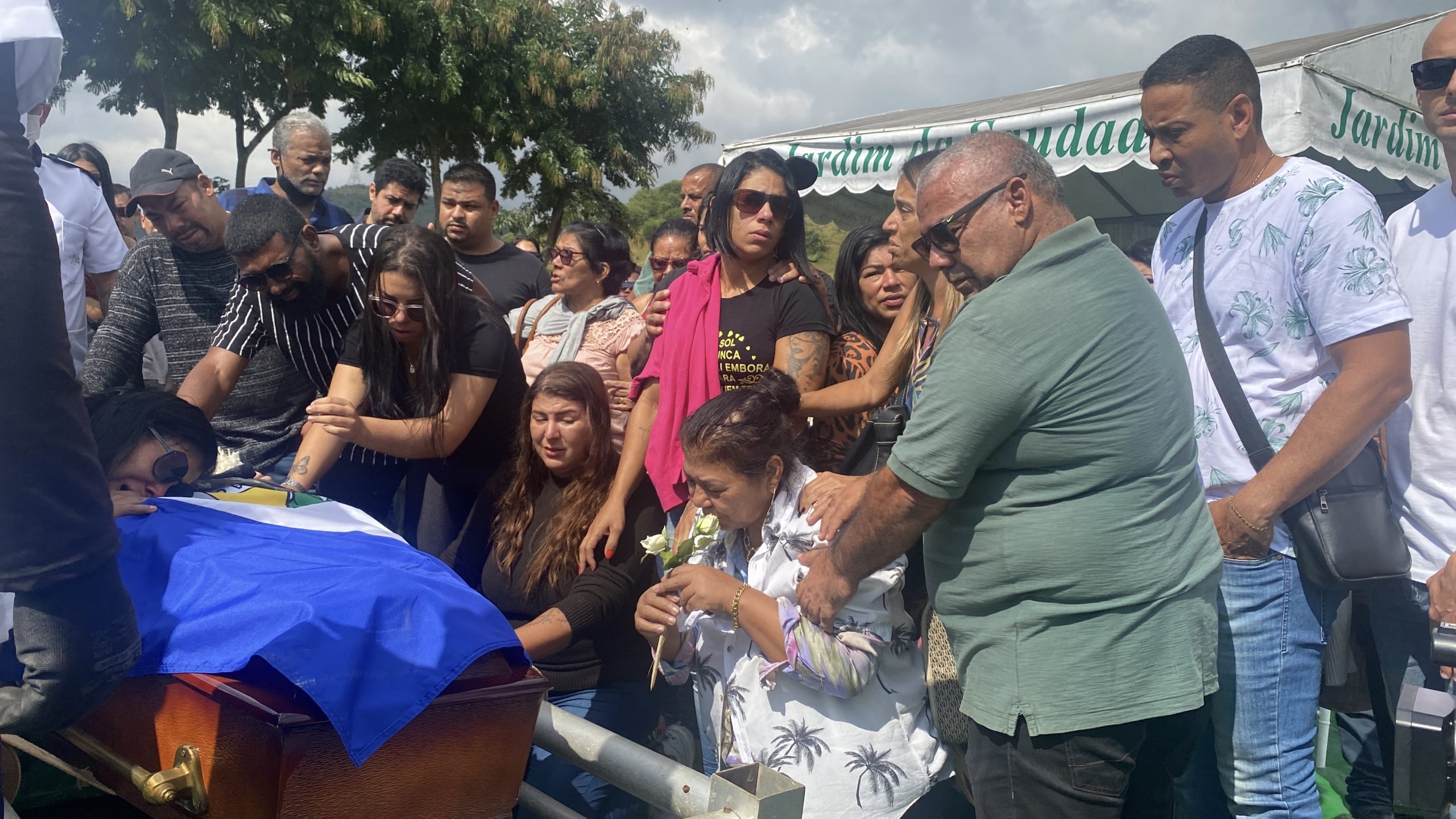 Mãe, uma das irmãs e viúva de policial civil se despedem do agente – Foto: Tatiana Campbell/Super Rádio Tupi
