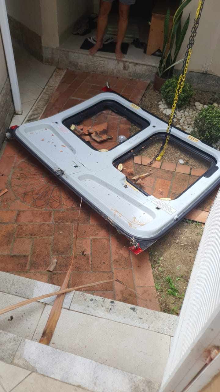 A porta da aeronave caiu em uma casa no bairro Matadouro. O incidente aconteceu enquanto eles sobrevoavam os pontos atingidos em Barra do Piraí.