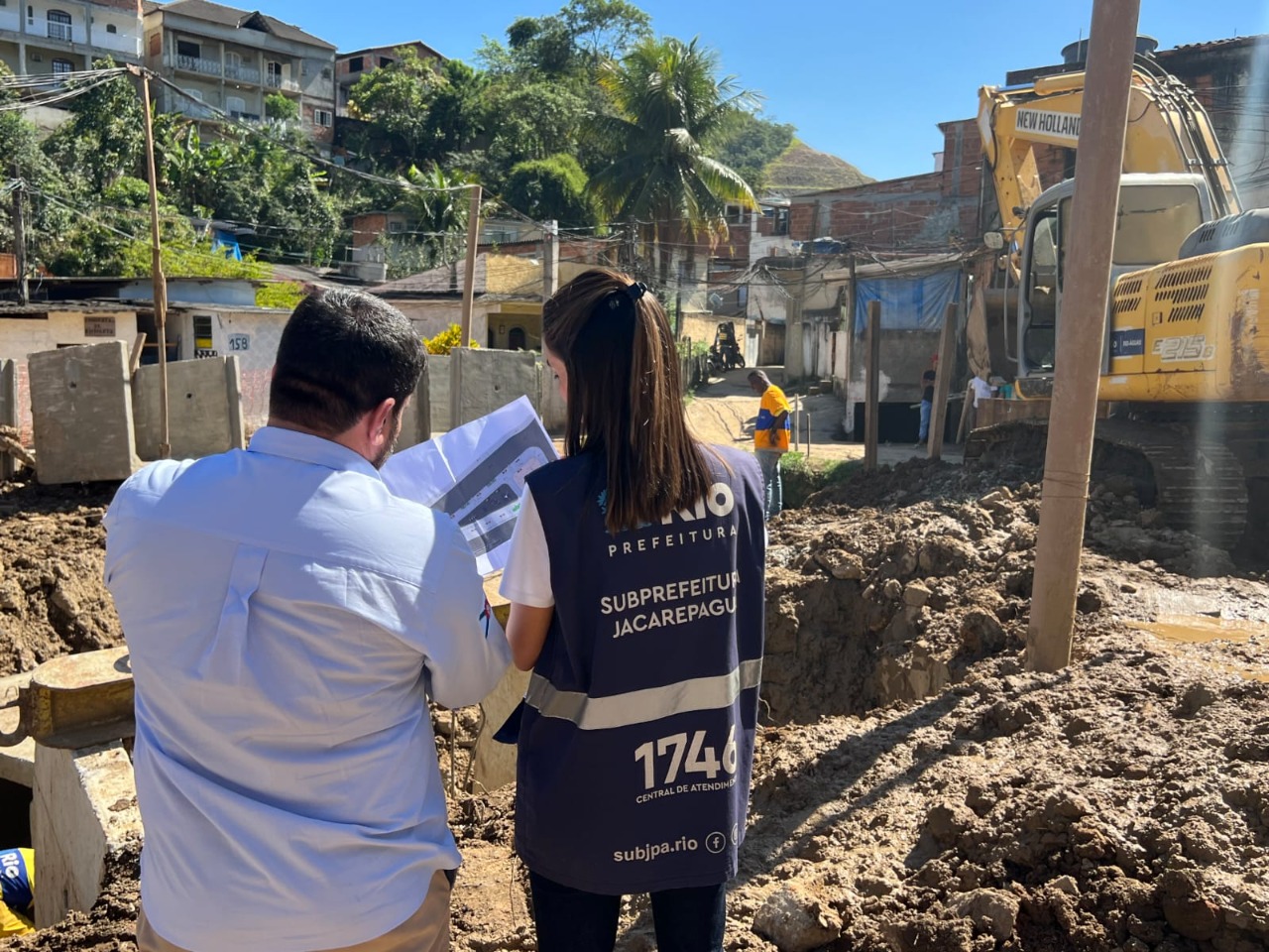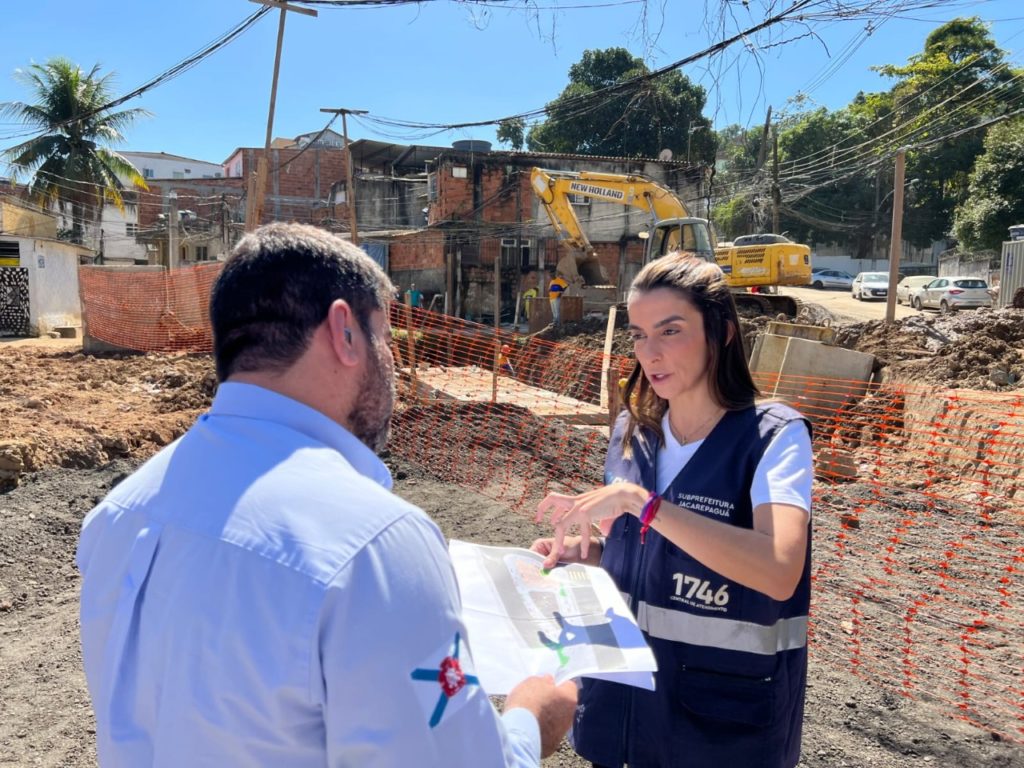 “No início da gestão, fui procurada por moradores da Rua Camatiá e soube que até carro caiu no buraco, quando a rua cedeu. Levei essa questão para o prefeito e ele imediatamente autorizou o orçamento pra gente realizar essa obra. Em breve, teremos outras intervenções e sempre ouvindo a população como tenho feito”, lembra a subprefeita de Jacarepaguá, Talita Galhardo, em visita à obra, com o presidente da Rio-Águas, Wanderson Santos.