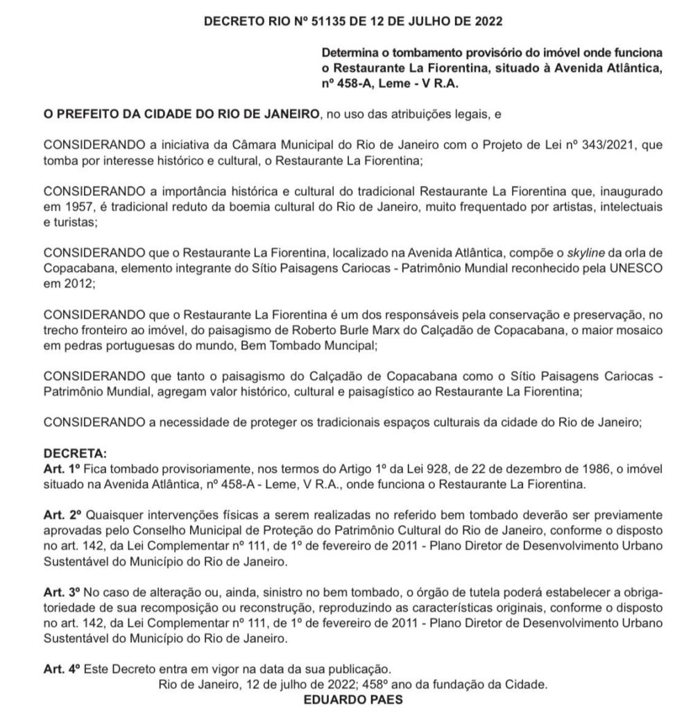 O prefeito Eduardo Paes tombou hoje o imóvel do restaurante La Fiorentina, na Avenida Atlântica 458 A, no Leme, na Zona Sul. O decreto leva em consideração a importância histórica e cultural do tradicional restaurante, inaugurado em 1957, e tradicional reduto da boemia cultural do Rio.