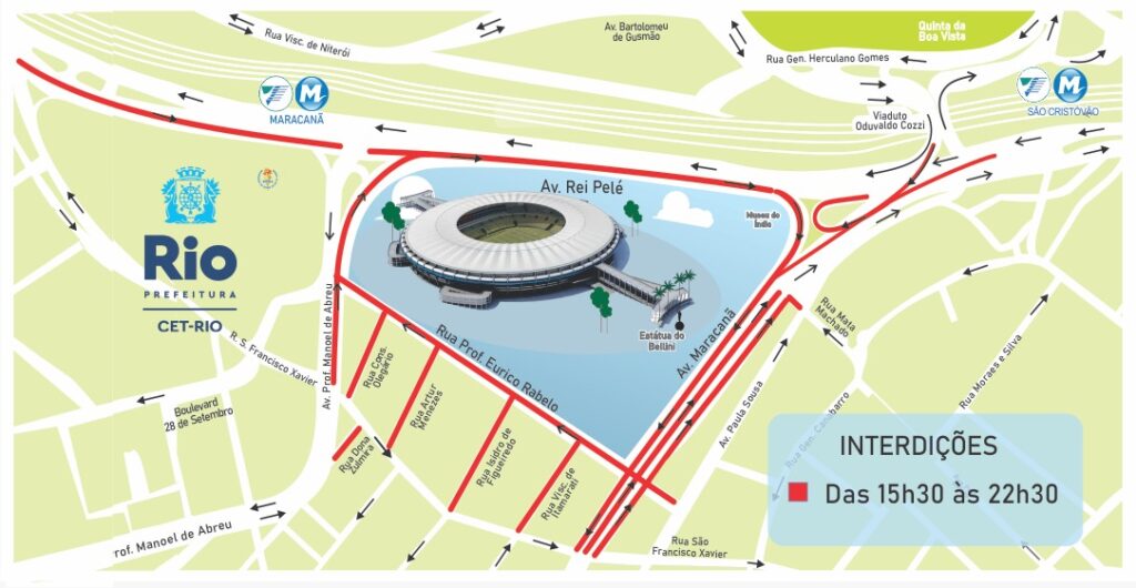 Vias do entorno do Maracanã serão bloqueadas ao trânsito às 15h30 (foto: divulgação/CET-Rio)