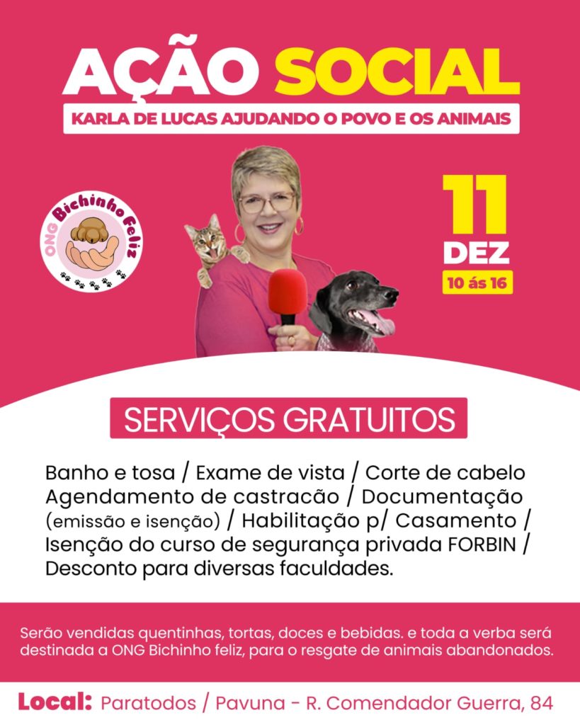 No domingo (11), a partir das 10h, Karla de Lucas e o projeto Bichinho Feliz estarão no Paratodos da Pavuna, na Rua Comendador Guerra, nº 84, promovendo o Natal Solidário com serviços gratuitos para o povo e os animais: banho e tosa, adestramento, orientação veterinária, corte de cabelo, exame de vista, isenção para curso de segurança privada.