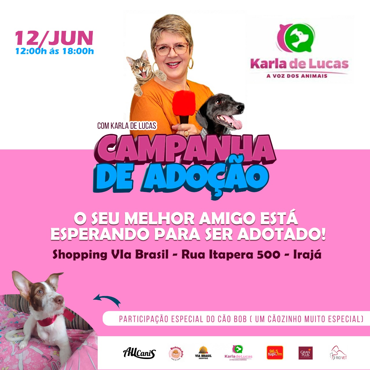 “Dia dos Namorados é um bom momento para demonstrar seu amor. Leve sua amada para adotar um outro amor: um animalzinho que foi abandonado ou maltratado e resgatado pelo Projeto Bichinho Feliz. Quem não gosta de bicho, não gosta de gente. Quem ama os animais, ama o ser humano. Então, vamos demonstrar esse amor, adotando!”, diz Karla.