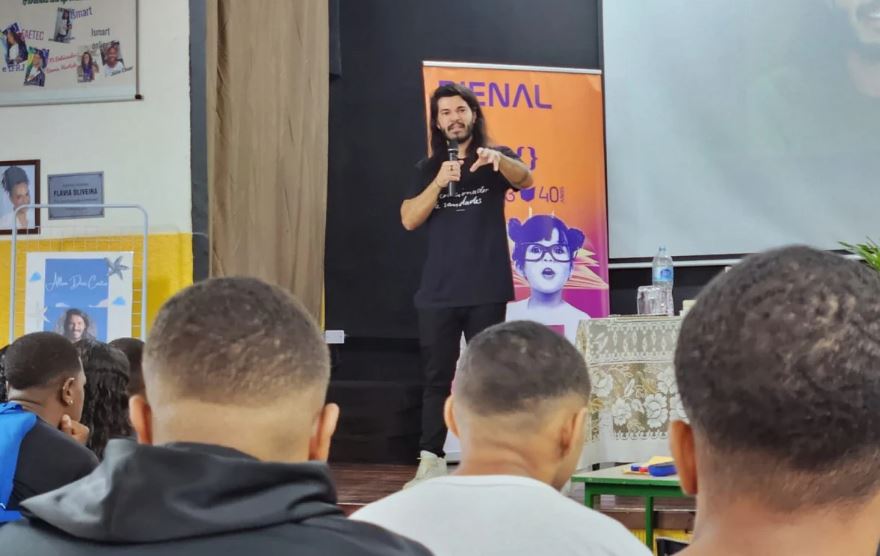 O Projeto Bienal nas Escolas foi até a Escola Municipal Embaixador Barros Hurtado, em Cordovil, na Zona Norte do Rio, na manhã desta quarta-feira (16), onde os alunos receberam o autor e escritor Allan Dias Catro, que apresentou uma oficina sobre técnicas de escrita.