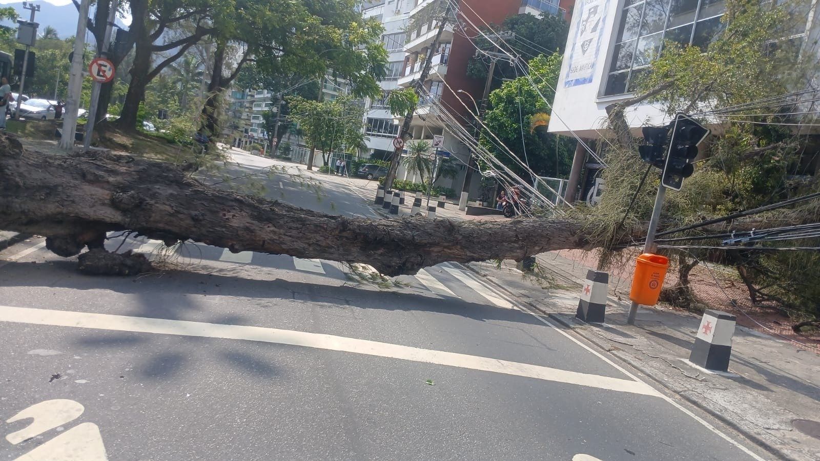 Via foi bloqueada no sentido Leblon; semáforos foram desligados após queda sobre a fiaçãoA queda de uma árvore interditou a Avenida Borges de Medeiros, na Lagoa, sentido Leblon, na tarde desta sexta-feira, 14. O tronco atingiu a fiação na altura da Rua General Tasso Fragoso, derrubou dois postes e provocou o desligamento dos semáforos.