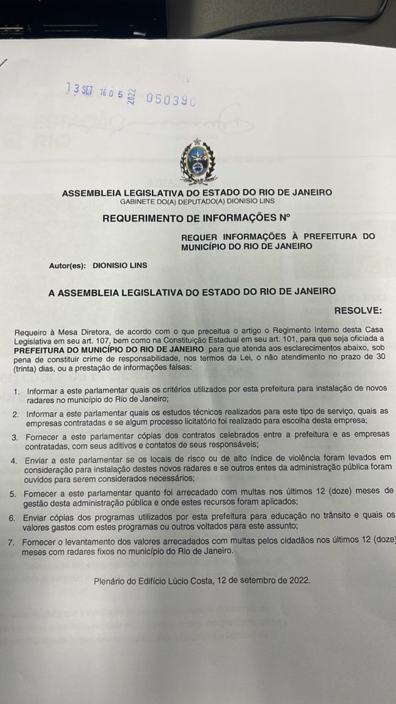 O presidente da Comissão de Transportes da Assembleia Legislativa, deputado Dionísio Lins (Progressista), encaminhou requerimento de informações para a prefeitura da cidade, onde pede que no prazo máximo de 30 dias, sejam enviadas explicações sobre a instalação de mais de 300 novos radares nas vias da cidade.