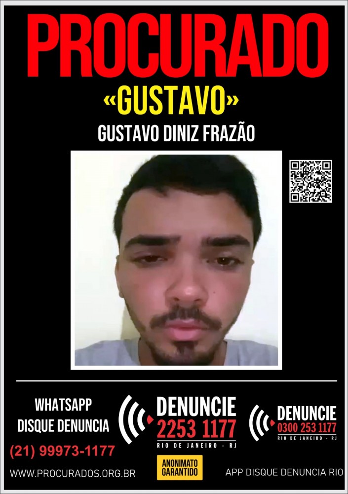 O Disque Denúncia divulgou um cartaz para ajudar a localizar Gustavo Diniz Frazão, de 22 anos, suspeito de ter matado Maria Eduarda de Oliveira Ramos, de 16 anos em Maricá.