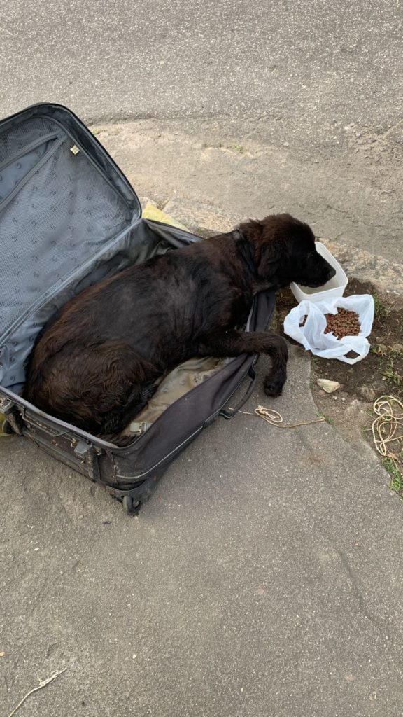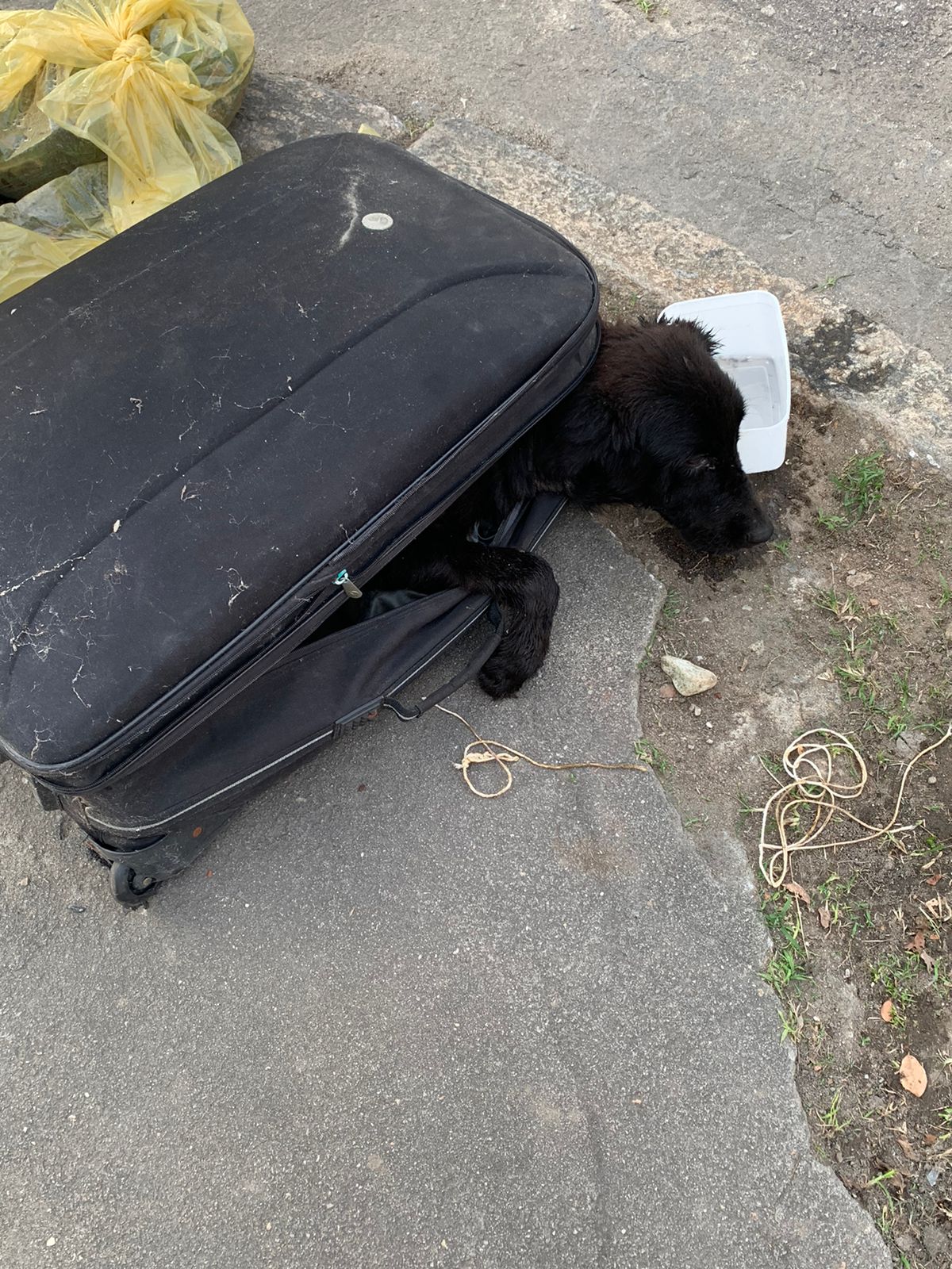 A cadela foi encontrada horas depois por populares que passavam pelo local e estranharam quando viram a mala “mexendo”. Ela estava tão debilitada que não conseguia se levantar. Duas mulheres a levaram para um clínica veterinária na região.