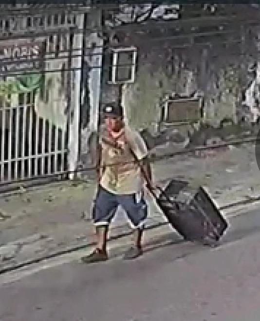 Nas imagens é possível ver que ele caminha tranquilamente pela rua enquanto arrasta a mala. Em determinado ponto da via, ele para, se aproxima de uma parte da calçada em que há um poste, deixa a mala deitada e vai embora.