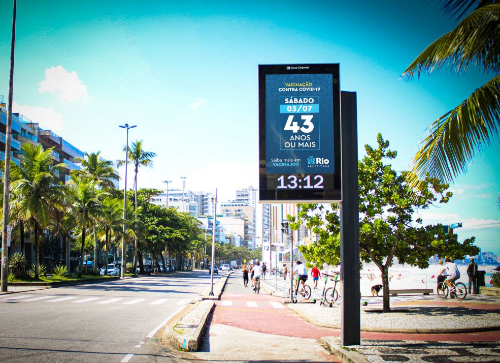 Os relógios digitais que informam hora e a temperatura nas ruas do Rio de Janeiro passam a informar o calendário oficial de vacinação contra a Covid-19. Cerca de 100 equipamentos, localizados nos principais bairros, vão ser atualizados diariamente com notificações indicando a idade e gênero a serem vacinados no dia atual e no dia seguinte. A iniciativa é uma parceria entre a Prefeitura do Rio de Janeiro e a Clear Channel, empresa responsável por parte do mobiliário urbano da cidade.