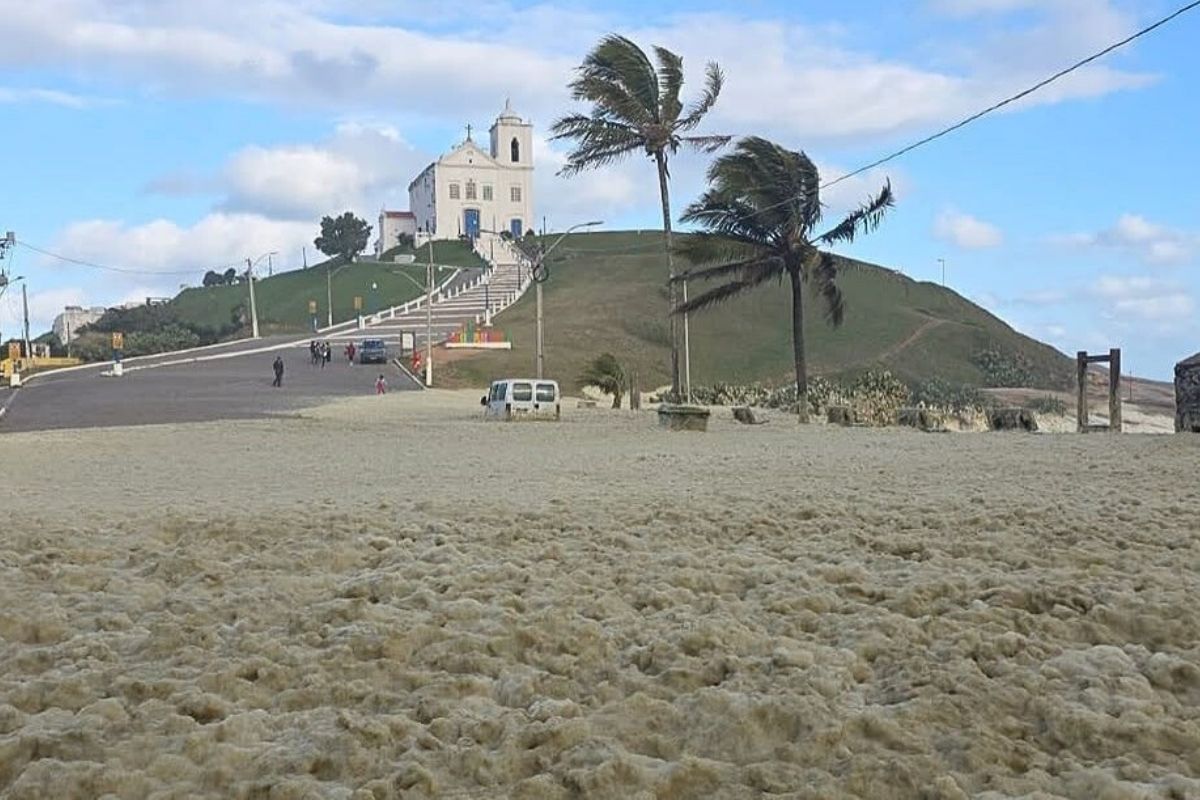 Uma impressionante camada de espuma marítima tomou conta do centro de Saquarema, na Região dos Lagos do Rio de Janeiro, nesta semana. O fenômeno ocorreu durante uma forte ressaca na Praia da Vila, onde as ondas chegaram a 3,5 metros de altura na última terça-feira (29).