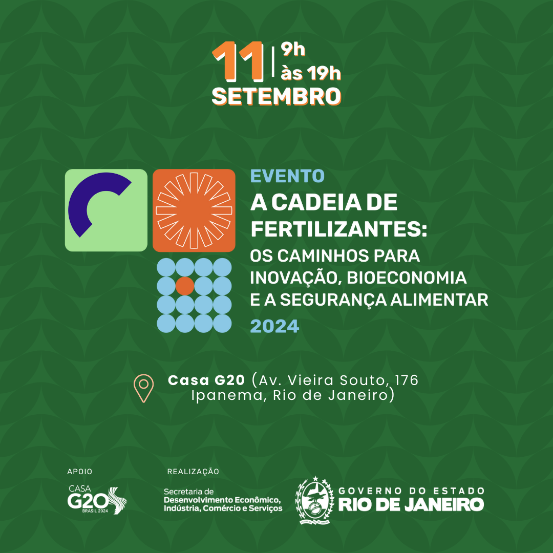 O Governo do Rio de Janeiro, através da secretaria de Desenvolvimento Econômico, Indústria, Comércio e Serviços, realizará, na próxima quarta-feira (11), de 9h às 19h, na Casa G20 (Casa de Cultura Laura Alvim), em Ipanema, na Zona Sul da cidade, um evento para debater caminhos para o fortalecimento da cadeia de fertilizantes no estado.