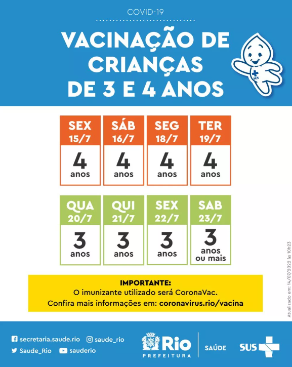 De acordo com a Secretaria Municipal de Saúde, para a imunização das crianças de 3 e 4 anos, será utilizada a CoronaVac, com esquema vacinal de duas doses e intervalo de 28 dias entre elas, conforme aprovação da Anvisa.