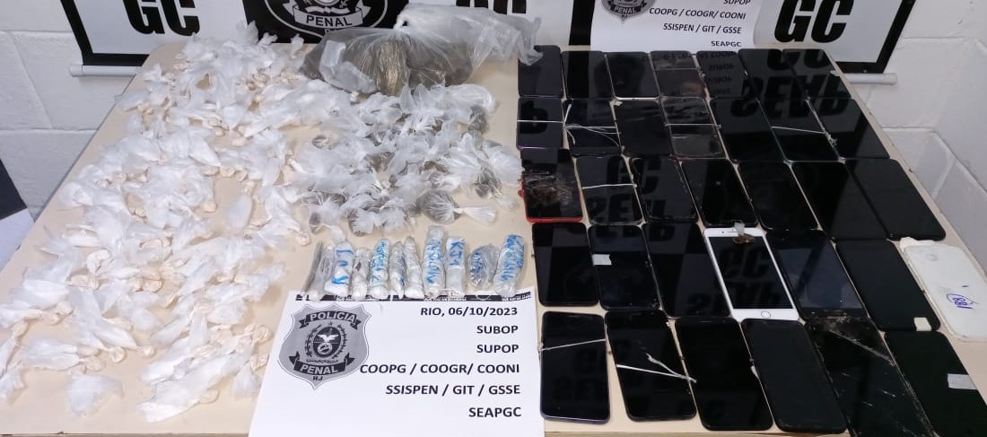 Polícia Penal apreende 58 aparelhos celulares e um quilo de material aparentemente entorpecente em ação de vistoria em Bangu 3 e Bangu 4