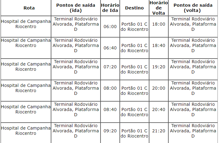 A Prefeitura do Rio, por meio da Secretaria Municipal de Educação, vai oferecer transporte gratuito para os servidores da saúde que vão trabalhar no Hospital Municipal de Campanha do Riocentro. Serão disponibilizados seis veículos na parte da manhã, com saída do Terminal Rodoviário Alvorada, Plataforma D, a partir das 6h com destino ao Portão 01 C do Riocentro. No final do dia, mais seis veículos serão disponibilizados, saindo do Riocentro, a partir das 18h, com destino ao Terminal Alvorada. Estes coletivos são da frota dos Ônibus da Liberdade, utilizados para levar os alunos às unidades escolares regularmente, mas que estão disponíveis por conta da suspensão das aulas em função da pandemia do novo coronavírus.