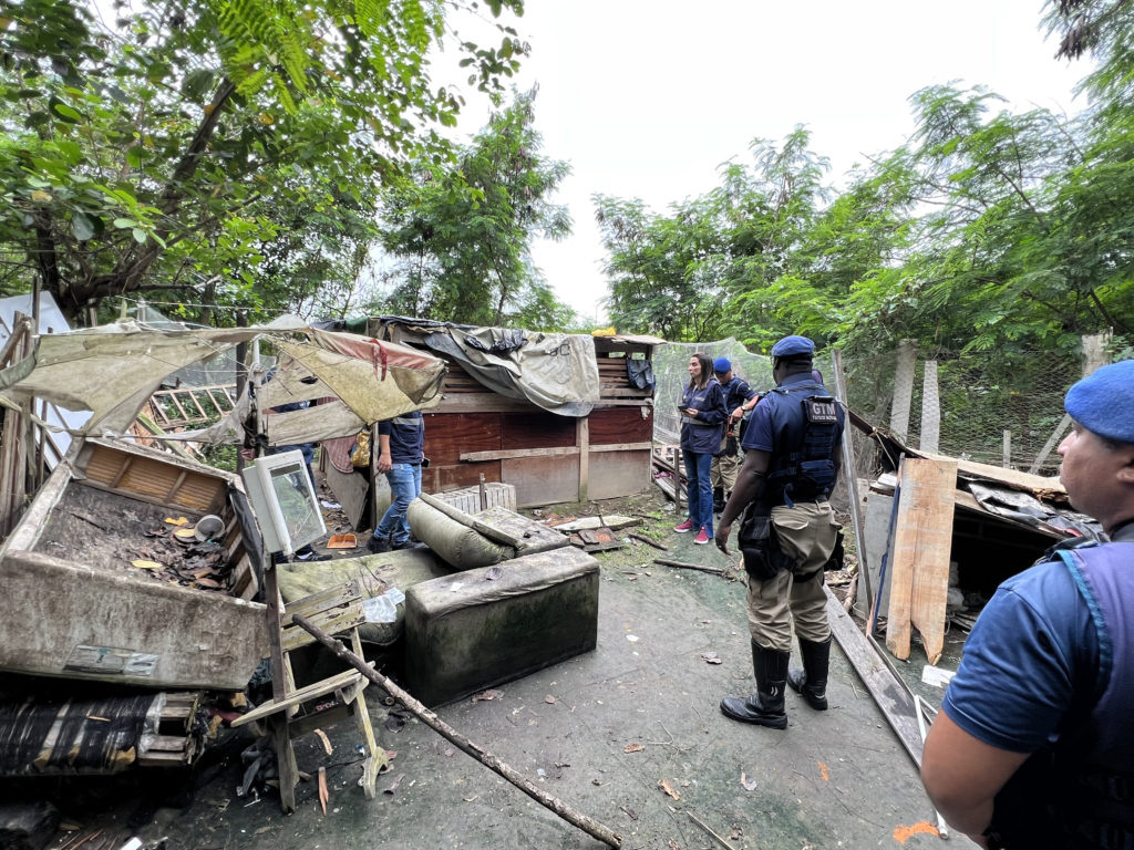 Em um espaço de mata, cerca de dez barracos construídos com lona e madeira serviam de casas para dezenas de pessoas, que também mantinham o local como um espaço para uso de drogas, além de ponto de prostituição.