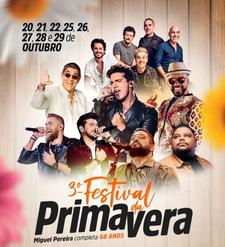 Zeca Pagodinho, Alexandre Pires, Jota Quest, Luan Santana e Zé Neto e Cristiano. Essas são algumas das atrações do Festival da Primavera de Miguel Pereira. Os shows, que marcam o aniversário de 68 anos da cidade, acontecem entre os dias 20 e 29 de outubro. Segundo o prefeito André Português, os eventos terão entradas grátis.