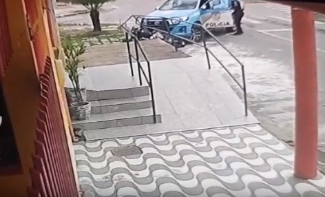 As imagens mostram dois policiais militares abordando dois ocupantes de uma motocicleta na Avenida Brasil, no bairro Village. A viatura do 37º BPM (Resende) se aproxima da moto e a encurrala. O suspeito que estava no carona foge correndo e um dos agentes corre atrás dele.