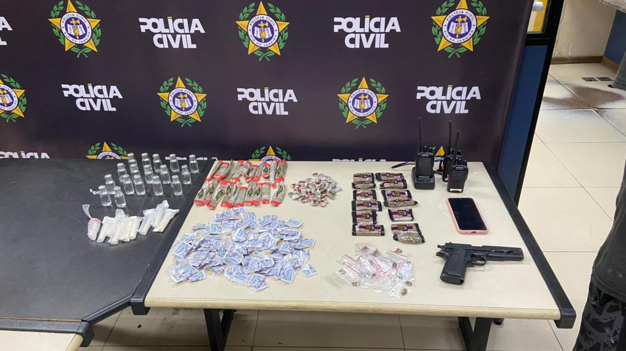 Durante a ação policial, foram apreendidas grandes quantidades de entorpecentes, além de um simulacro de pistola e rádios transmissores, itens frequentemente utilizados no controle e comunicação de atividades ilícitas no tráfico.