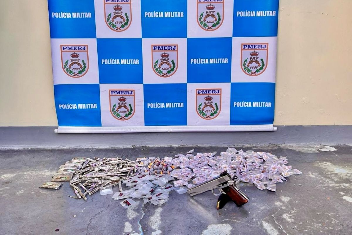 Com o homem foram apreendidos uma pistola, munições, maconha, cocaína e pedras de crack. O outro suspeito fugiu.