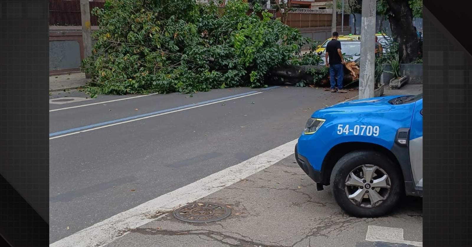 Equipes da CET-Rio e da Polícia Militar atuam no local. A Comlurb foi acionada para a retirada da árvore.