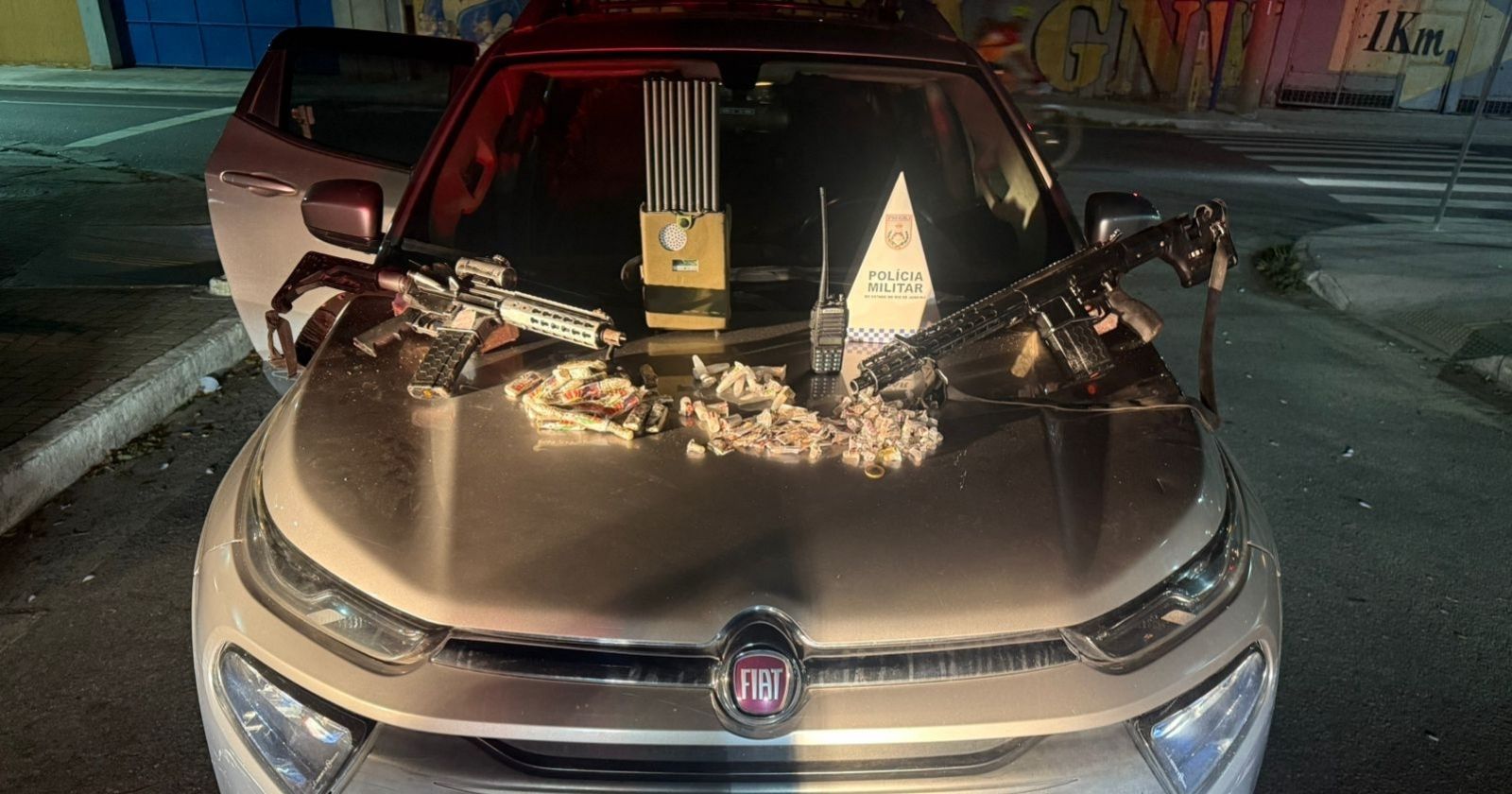 Na ação, os agentes prenderam um suspeito e apreenderam dois fuzis, um bloqueador de sinal GPS, um rádio comunicador, 28 trouxinhas de maconha, 117 papelotes de crack e um carro.